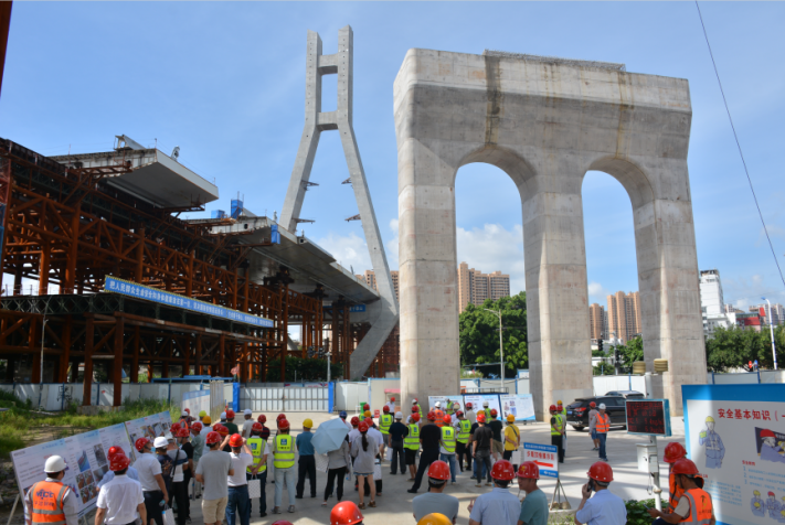 2020年6月28日,由龍巖城市發(fā)展集團(tuán)有限公司主辦,龍巖市政建設(shè)集團(tuán)有限公司(市城投公司)承辦,北京鐵研建設(shè)監(jiān)理有限公司、中國(guó)建筑第六工程局有限公司、中冶(上海)鋼結(jié)構(gòu)科技有限公司協(xié)辦的龍巖大道高架橋項(xiàng)目質(zhì)量安全標(biāo)準(zhǔn)化觀摩會(huì)在龍巖大道高架橋主橋鋼箱梁工程現(xiàn)場(chǎng)舉行。觀摩會(huì)分拼裝區(qū)域、提升站區(qū)域、頂推滑移區(qū)域、步履滑移區(qū)域及主橋轉(zhuǎn)體區(qū)域分別展示了龍巖大橋主橋鋼結(jié)構(gòu)拼裝、提升、弧形頂推滑移、步履滑移等新工藝及主塔“水平二次轉(zhuǎn)體”、鋼箱梁頂推、斜拉索施工技術(shù)