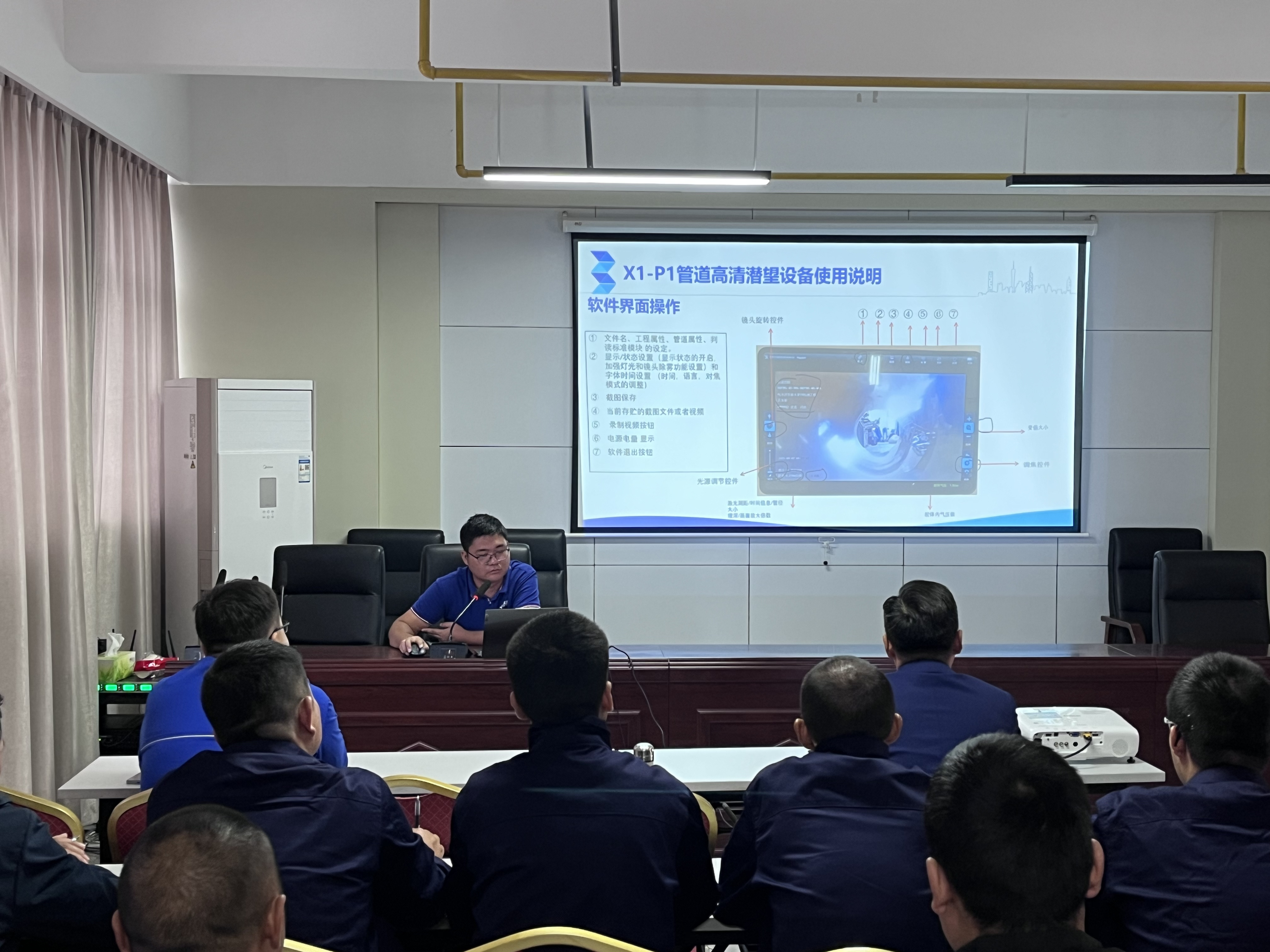 本次培訓(xùn)采用“理論+實(shí)操”相結(jié)合模式。理論授課環(huán)節(jié),授課老師圍繞CCTV管道檢測機(jī)器人工作原理、設(shè)備結(jié)構(gòu)組成、操作規(guī)范及安全注意事項(xiàng)等內(nèi)容,通過PPT展示和應(yīng)用案例開展系統(tǒng)授課。參訓(xùn)員工全神貫注,詳細(xì)記錄操作要點(diǎn),積極與老師互動(dòng)交流,對這位“新伙伴”有了初步的理論認(rèn)知。